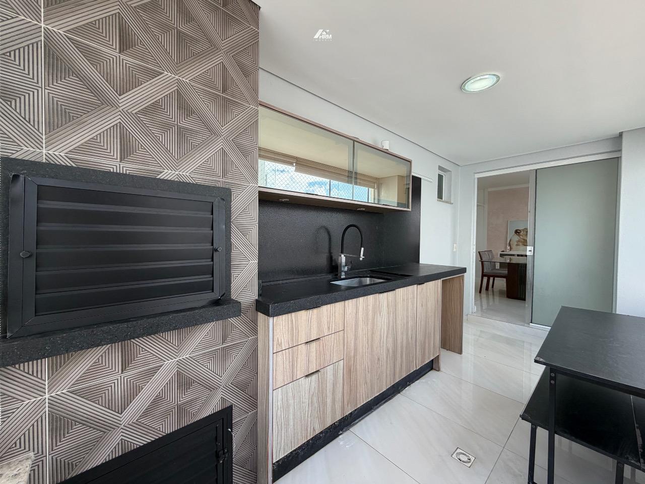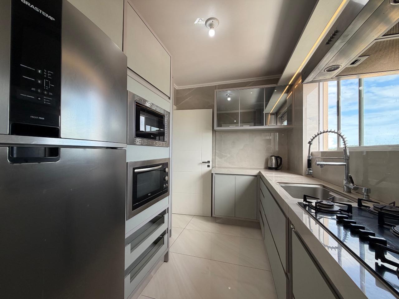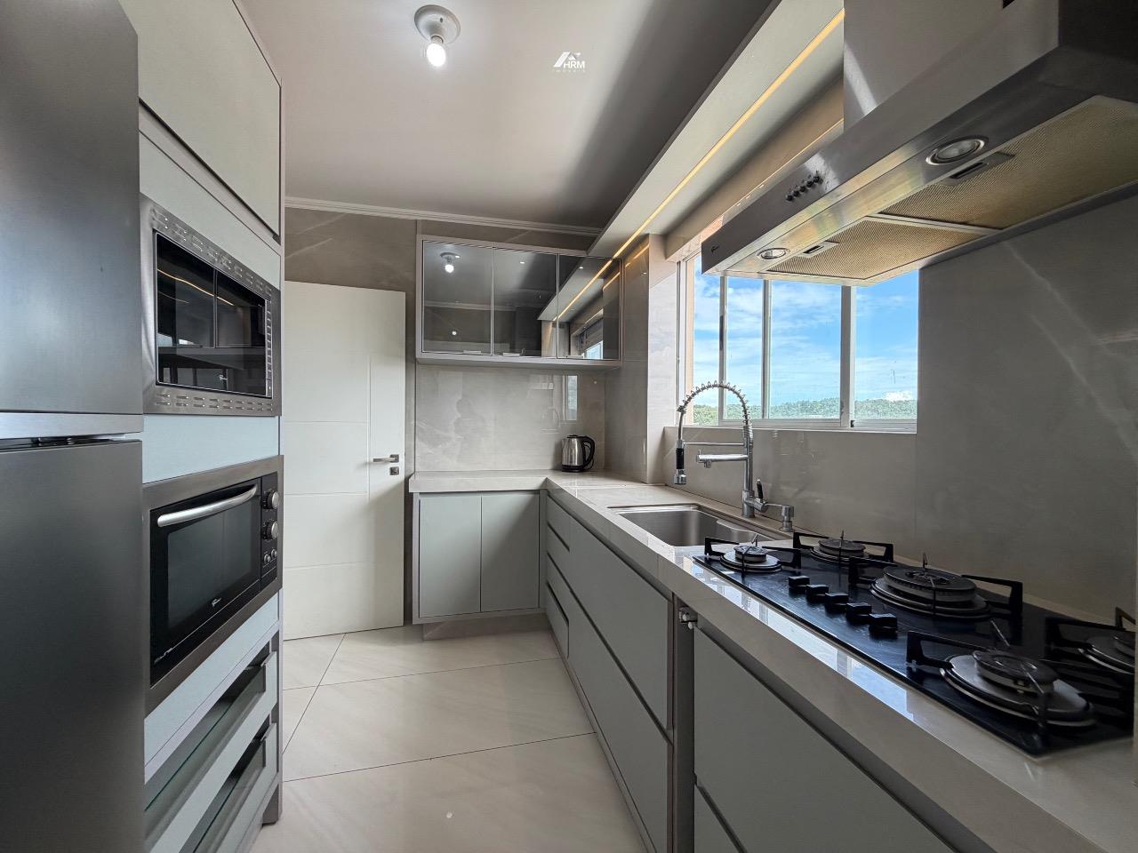 Composto por 03 suítes (sendo uma suíte e duas demi), ampla sala de estar com sacada, churrasqueira a carvão, cozinha com lavanderia, aquecimento a gás.