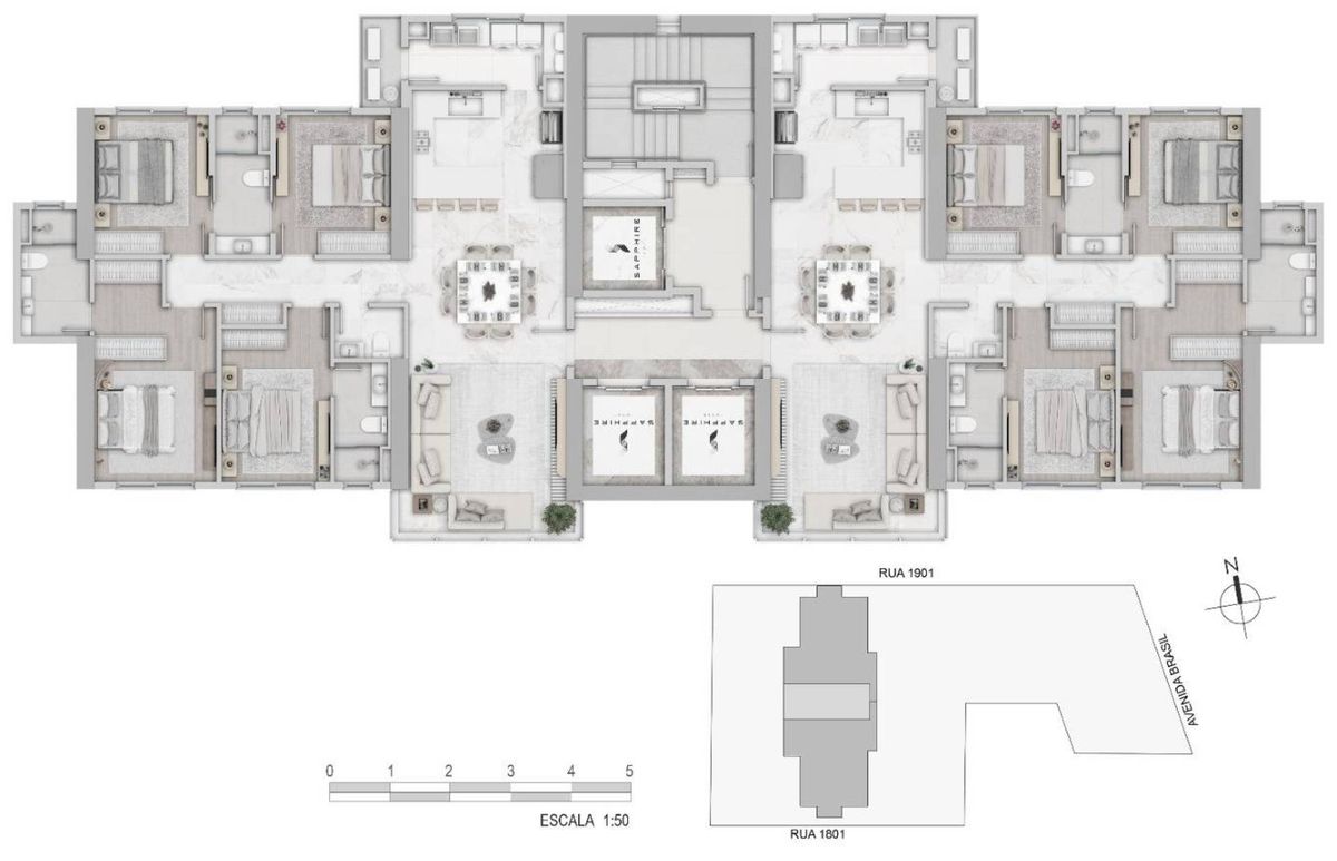 O Empreendimento está localizado na Avenida Brasil na Barra Norte de Balneário Camboriú, a poucos metros do mar, conta com 02 apartamentos por andar, sendo 59 pavimentos, 215m de altura, 02 pavimentos de lazer, rooftop com vista panorâmica.