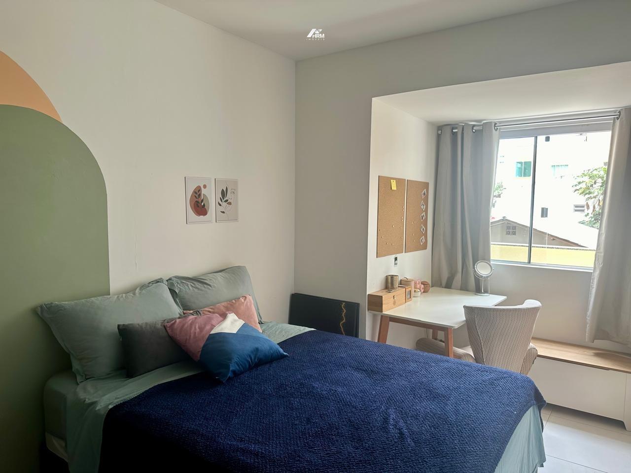 O apartamento está completamente mobiliado, decorado e climatizado, com acabamento em piso porcelanato, além de contar com box de praia e uma vaga de garagem privativa.