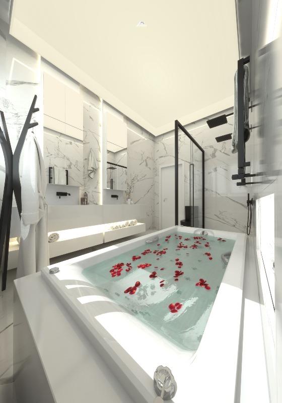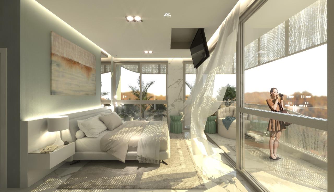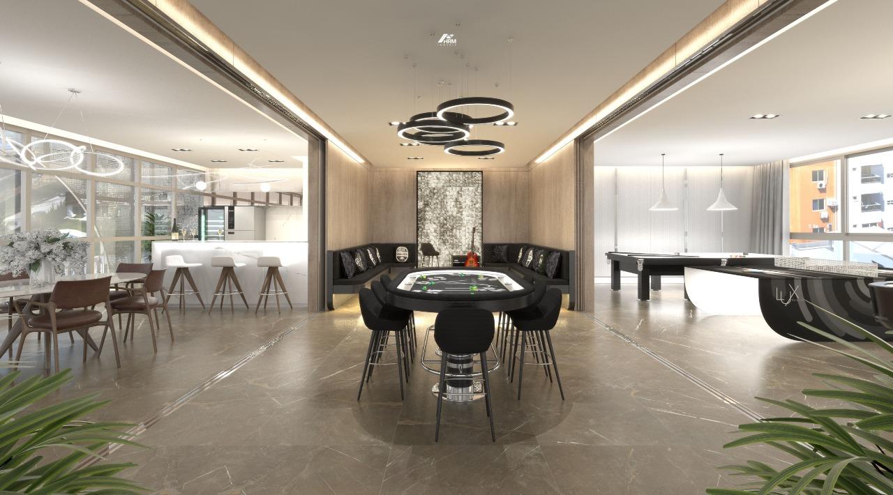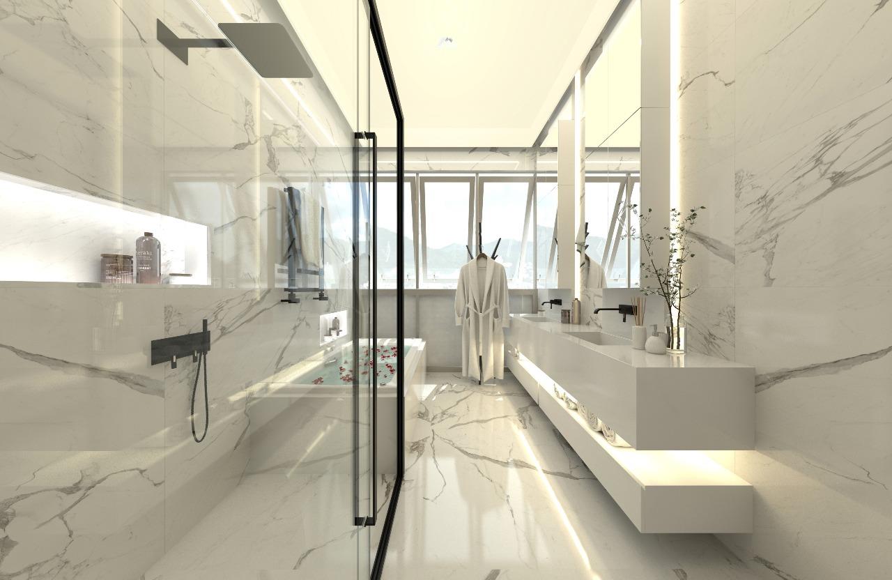 Apartamento sofisticado com acabamento em gesso e piso em porcelanato, oferecendo sala de estar, jantar, living, home office, cozinha americana com despensa, área de serviço e varanda gourmet com vista panorâmica. Conta com banheiro social, lavabo, banheiro auxiliar, closet e banheira de hidromassagem.