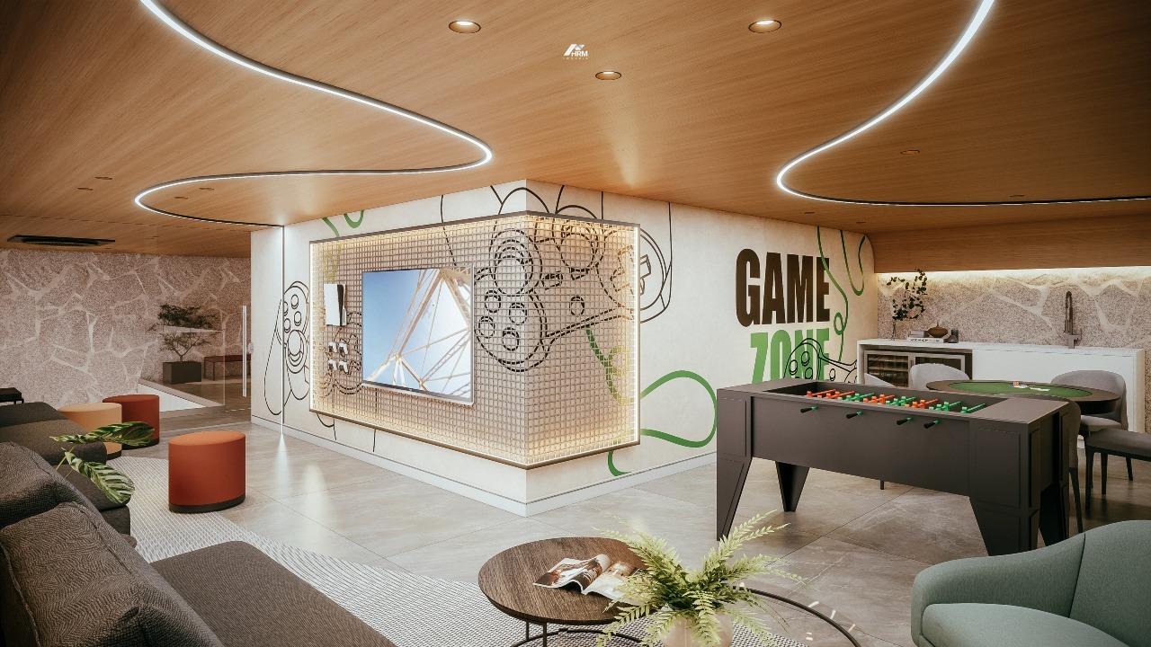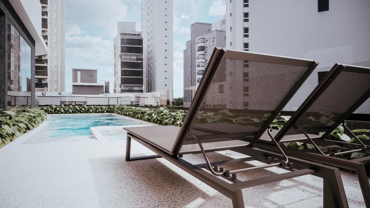 No segundo pavimento, a suíte principal com closet proporciona privacidade e conforto, além de oferecer uma vista panorâmica da cidade. A unidade ainda inclui sacada, varanda gourmet e infraestrutura tecnológica, como fechadura com senha e preparação para split.