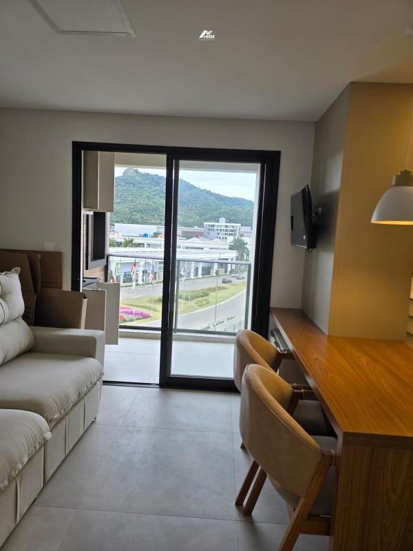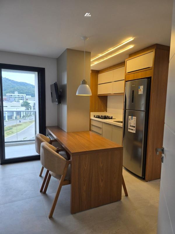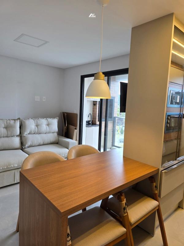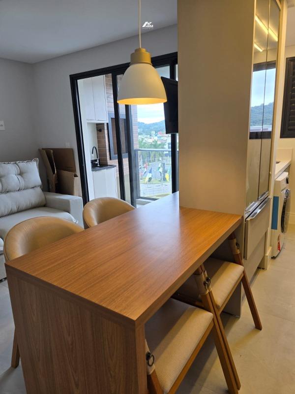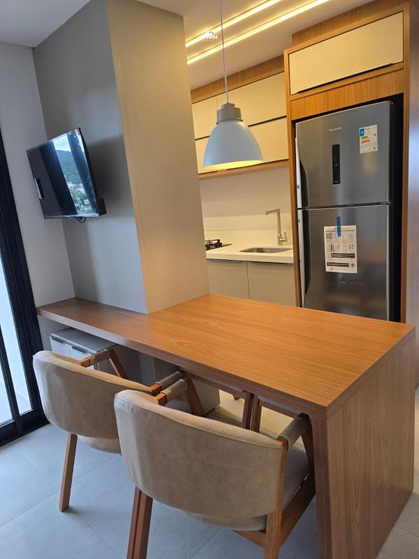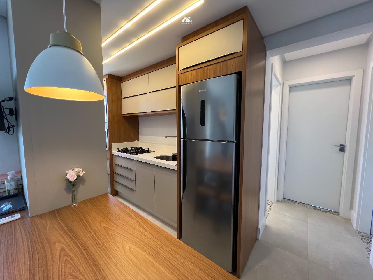 Apartamento mobiliado e equipado, no centro, com 60,77m² privativos, composto por 2 quartos, sendo 1 suíte, banheiro, sala integrada com a cozinha e área de serviço, sacada com churrasqueira a carvão, além de 2 vagas de garagem.