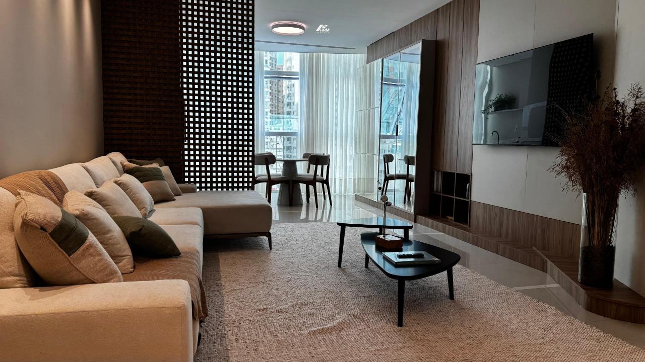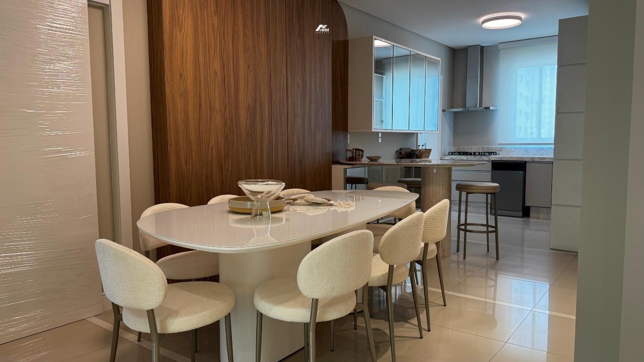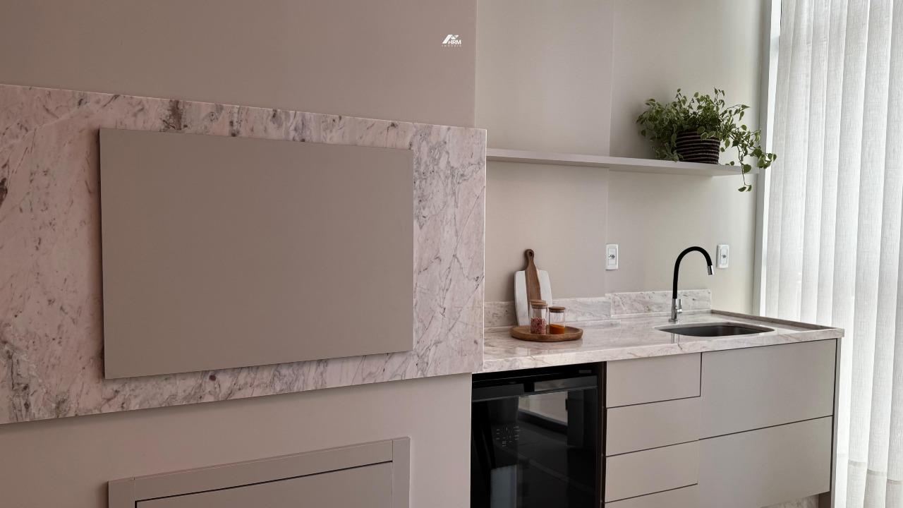 O apartamento conta com living integrado e espaçoso, lavabo e banheiro social, cozinha com armários planejados e área de serviço. Possui infraestrutura para água quente, aquecimento a gás, espera para ar-condicionado tipo split, acabamento em gesso e porcelanato, além de churrasqueira privativa. Hidrômetro individual, gás individual, interfone e hall de entrada decorado e mobiliado garantem praticidade. Sala de jantar, sala de estar, móveis planejados e armários embutidos completam o espaço interno.