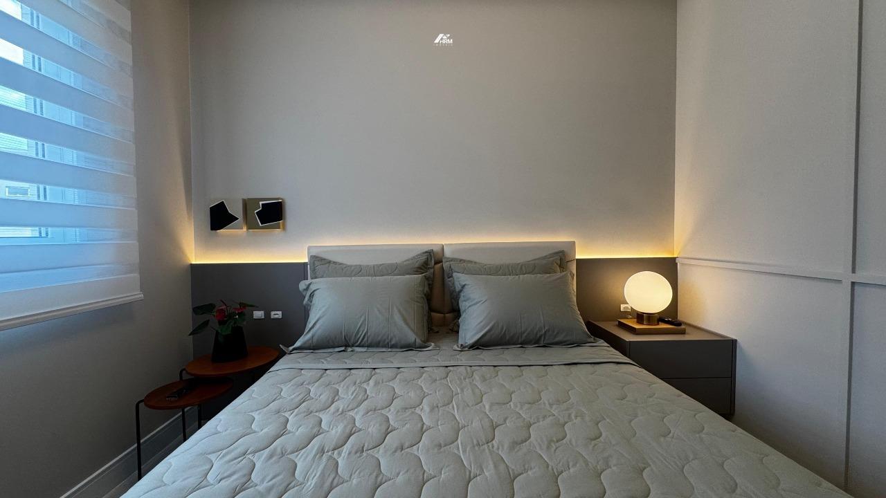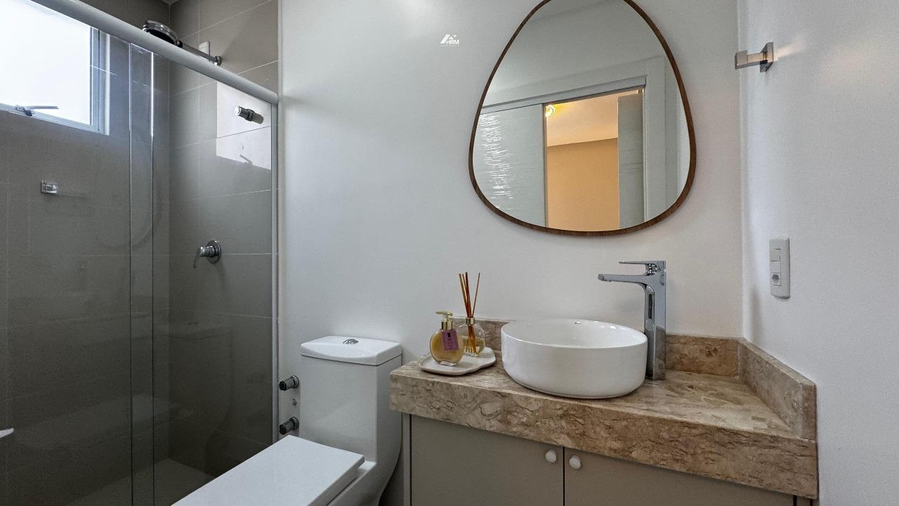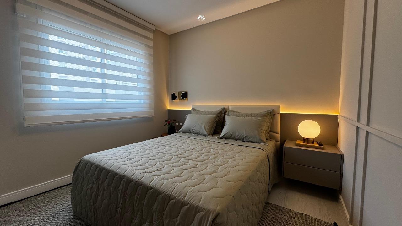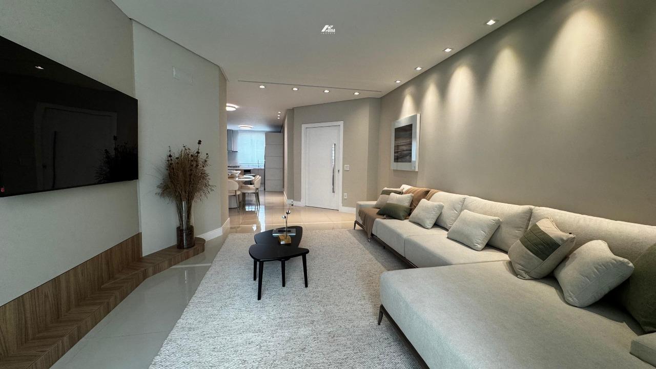 O apartamento conta com living integrado e espaçoso, lavabo e banheiro social, cozinha com armários planejados e área de serviço. Possui infraestrutura para água quente, aquecimento a gás, espera para ar-condicionado tipo split, acabamento em gesso e porcelanato, além de churrasqueira privativa. Hidrômetro individual, gás individual, interfone e hall de entrada decorado e mobiliado garantem praticidade. Sala de jantar, sala de estar, móveis planejados e armários embutidos completam o espaço interno.