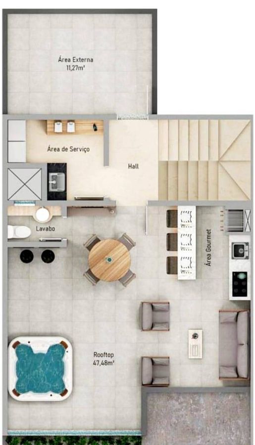 03 suítes, Living, Cozinha, Lavabo, Lavanderia, Espaço gourmet, Terraço com jacuzzi, Cozinha, Lavabo, Área de serviço, 02 vagas de garagem;