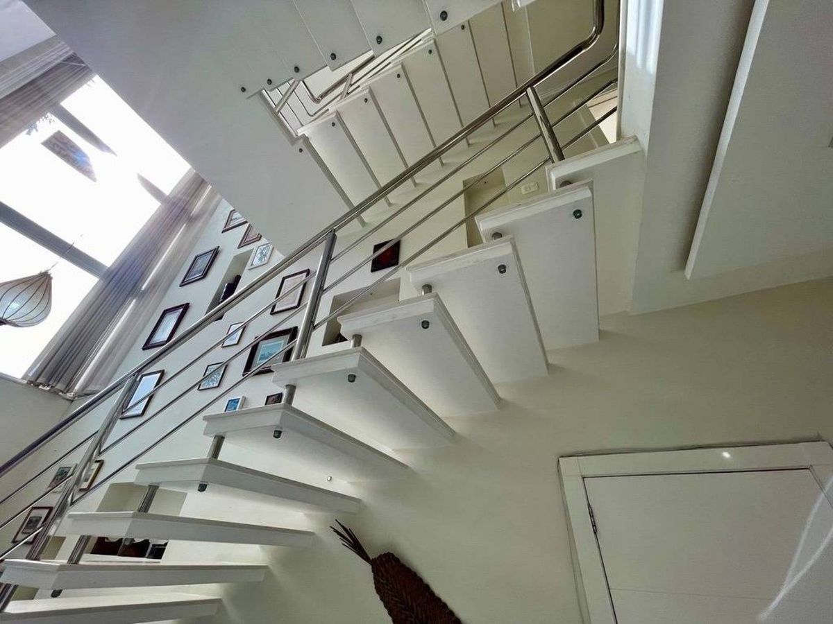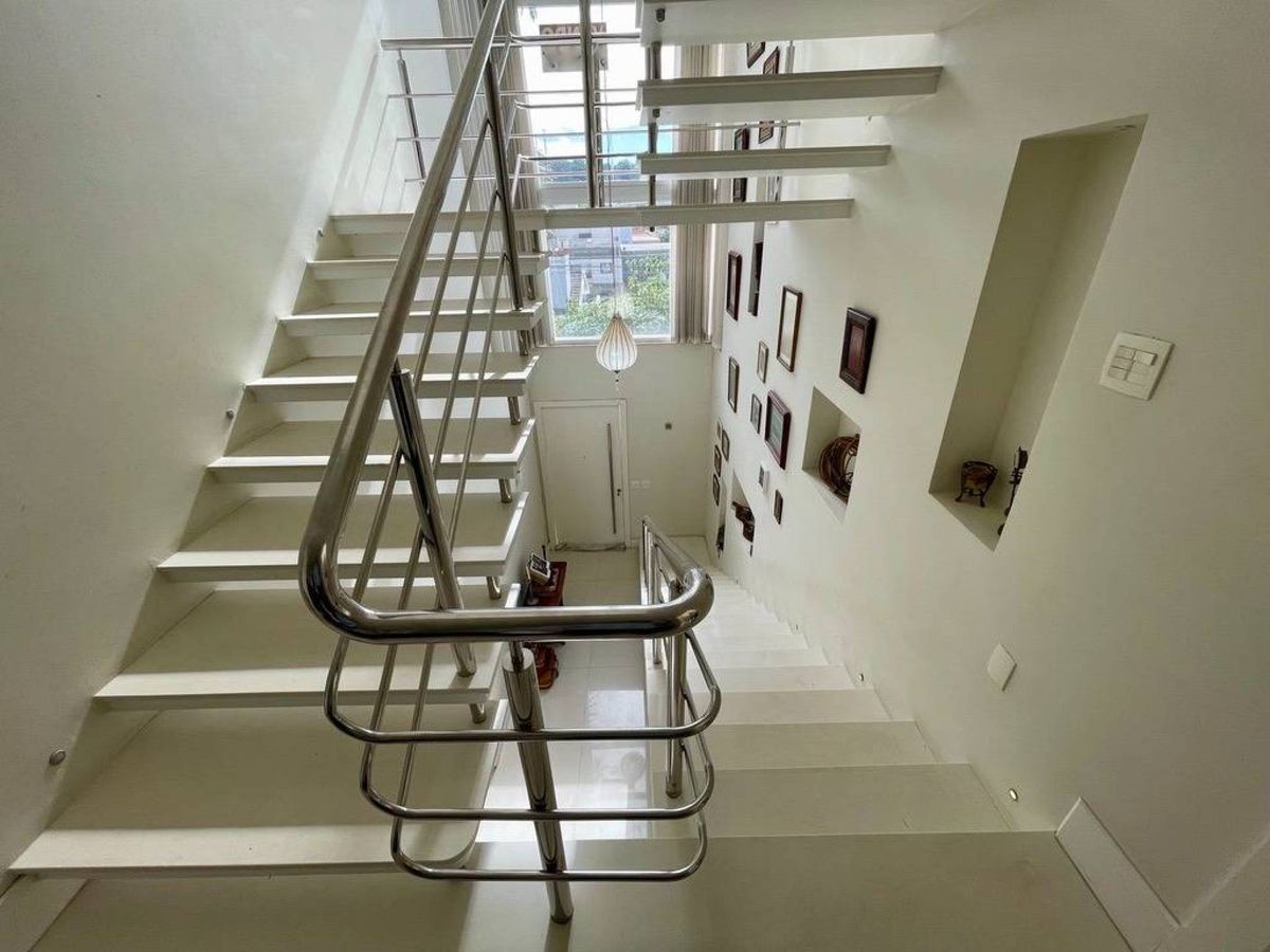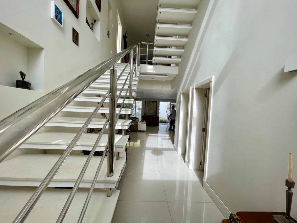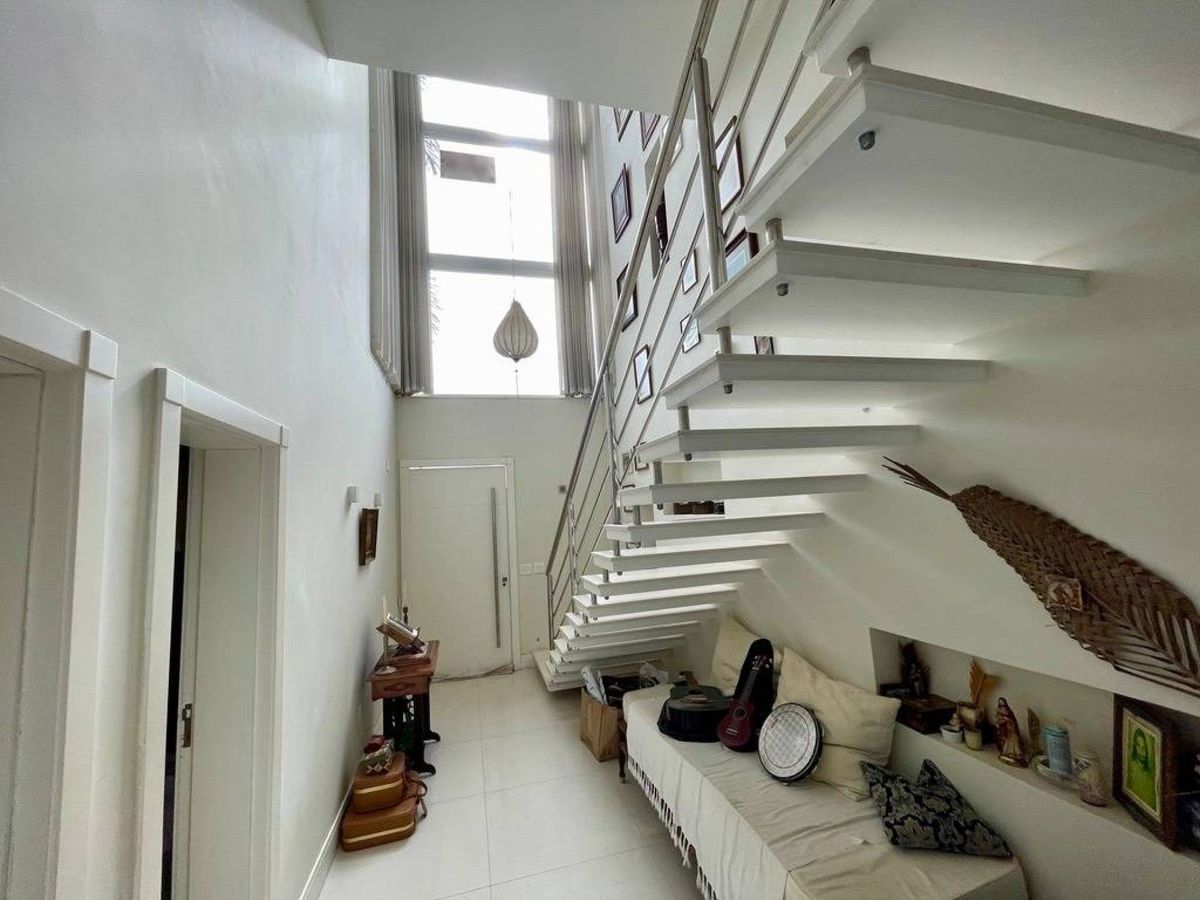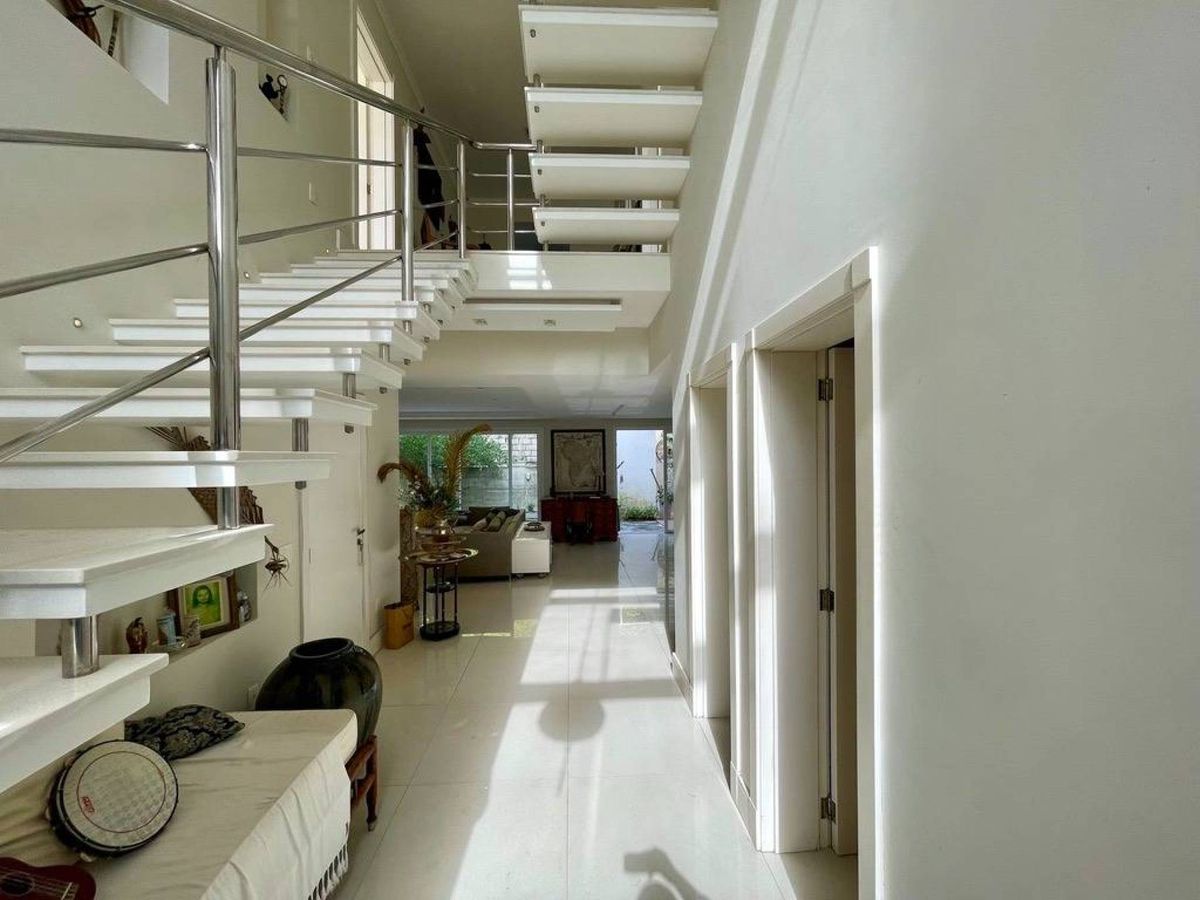 Ao entrar na casa já notamos o pé direito interno de 9 metros de altura, conferindo uma sensação de amplitude e requinte a todos os ambientes. A escada interna revestida com compacstone branco, iluminada e corrimão em aço inox é uma verdadeira obra de arte.