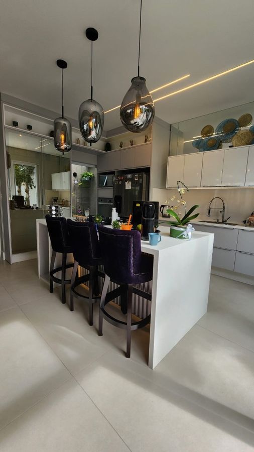 : Sala de estar, jantar e cozinha em conceito aberto, ideal para momentos em família e com amigos.