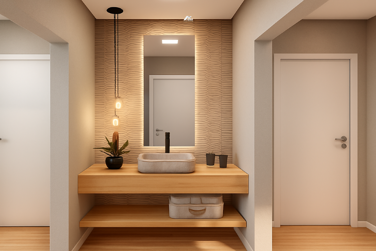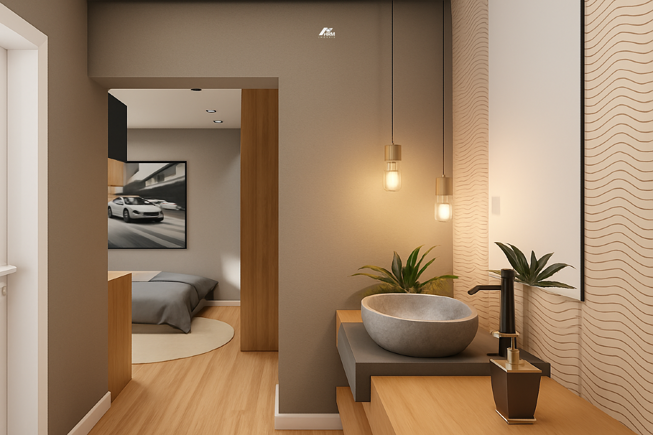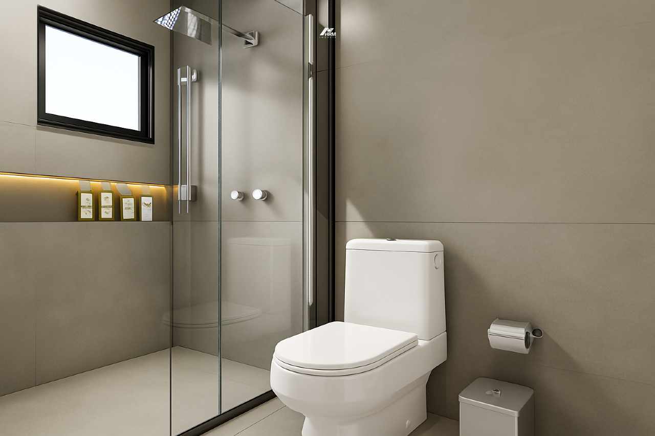 Com apenas duas unidades térreas independentes, a fachada apresenta pele de vidro harmonizada com revestimentos diferenciados, valorizando o design contemporâneo e minimalista. A arquitetura explora a topografia do terreno e a orientação solar, resultando em ambientes naturalmente iluminados e bem ventilados. O lavabo é equipado com tampo em mármore retroiluminado, cuba esculpida e torneira de design, enquanto o banheiro da suíte master conta com preparação para cuba dupla.