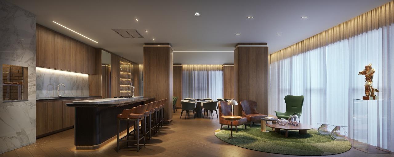 Com um layout moderno e funcional, conta com sala de estar e jantar, lavabo, churrasqueira a carvão, terraço técnico, área de serviço com banheiro, além de piso porcelanato 1,20 x 1,20 m, pré-automação e fechadura biométrica. O pé-direito diferenciado amplia ainda mais a sensação de liberdade.