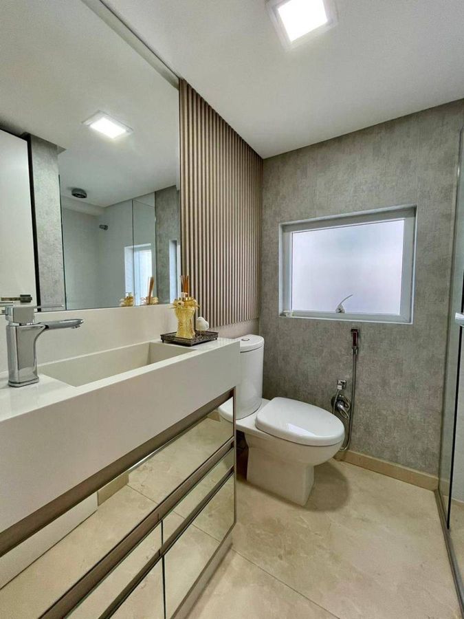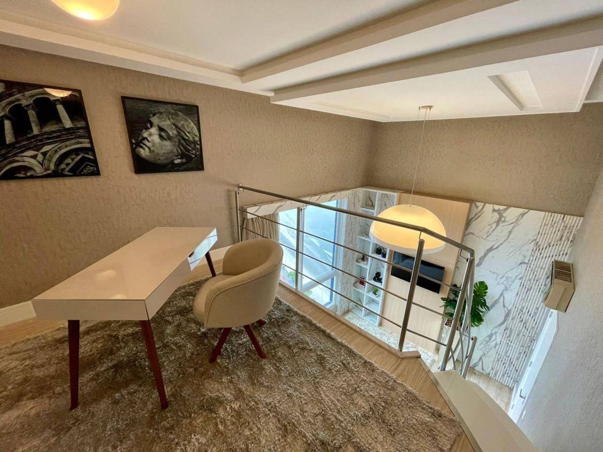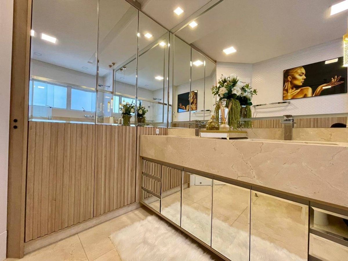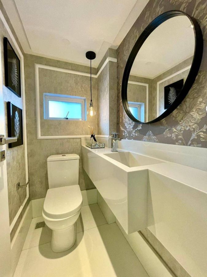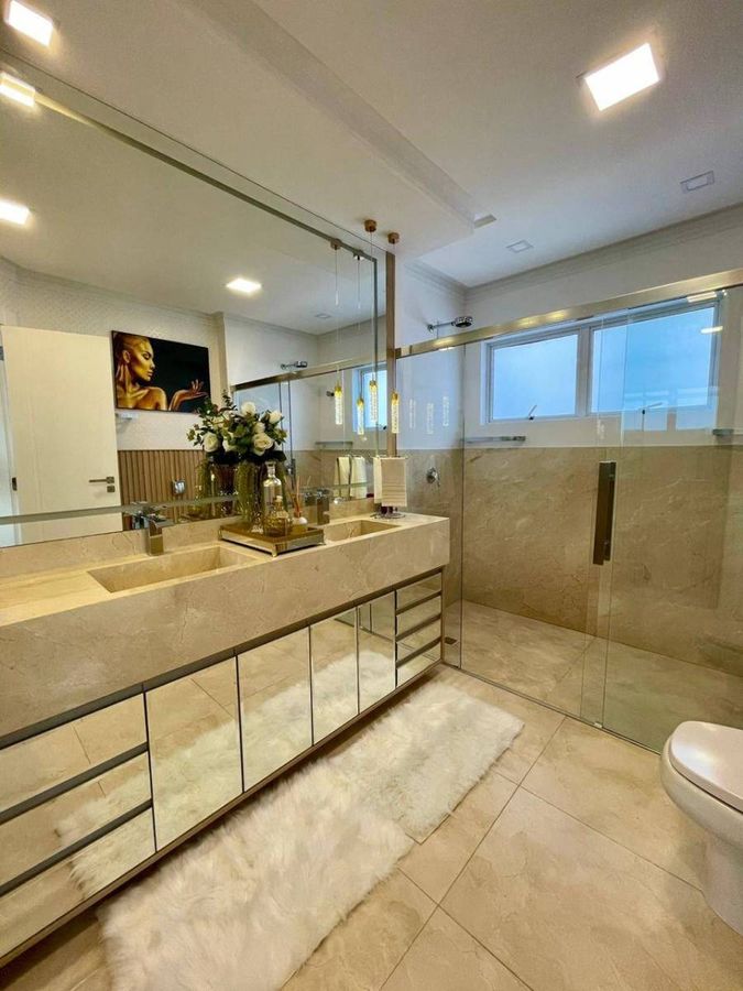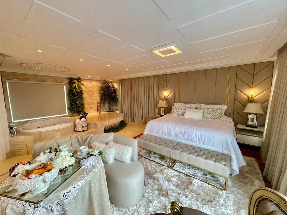 4 Suítes (sendo que 1 Suíte possui sacada e pé direito alto; e 2 suítes tem mezanino ) Lavabo