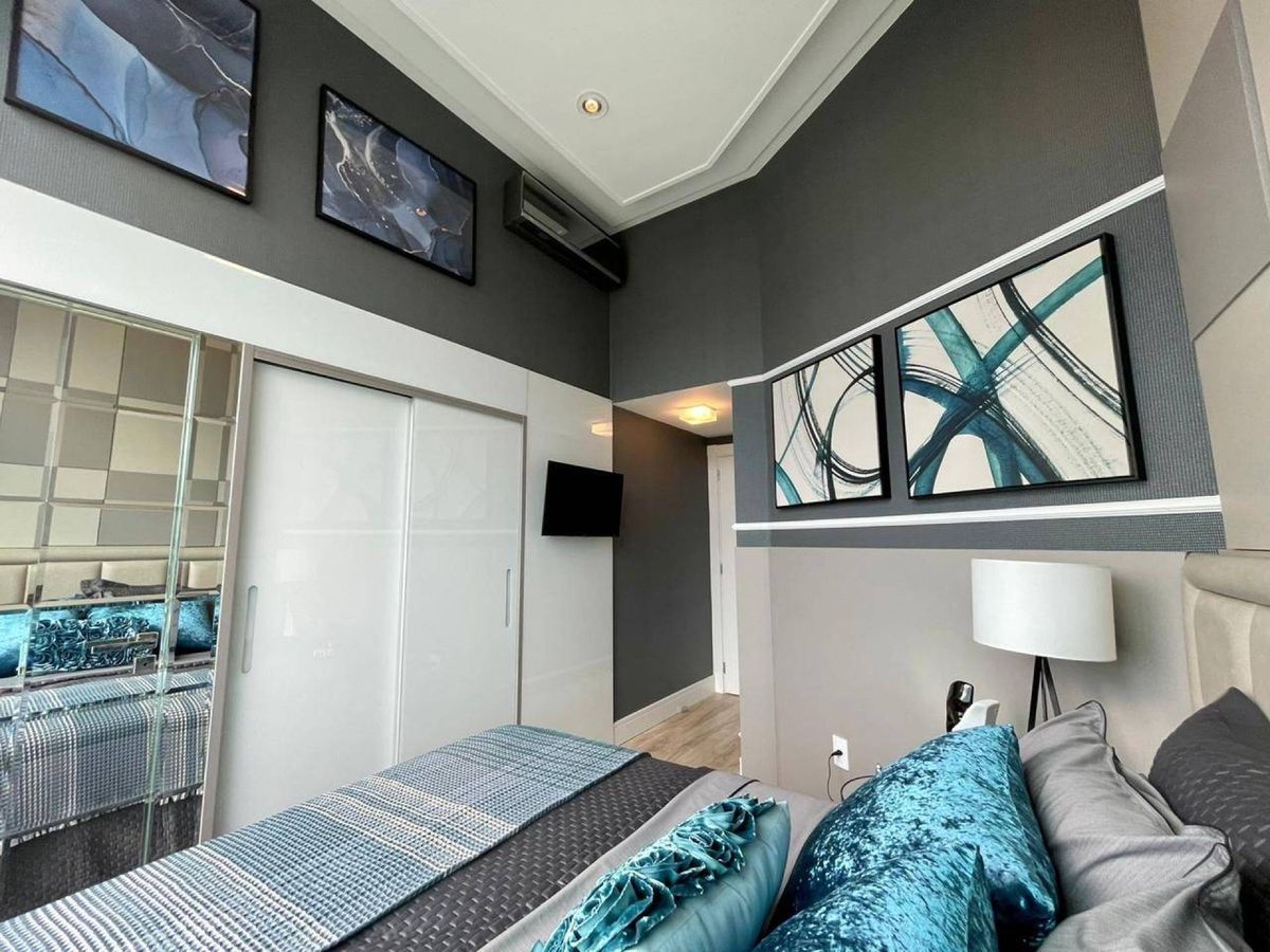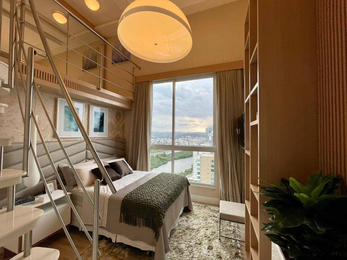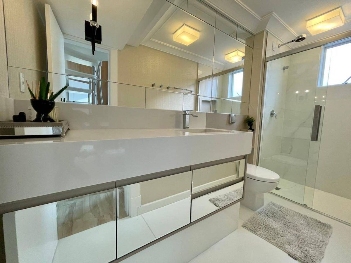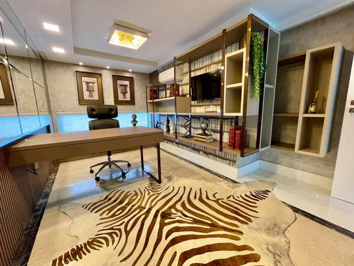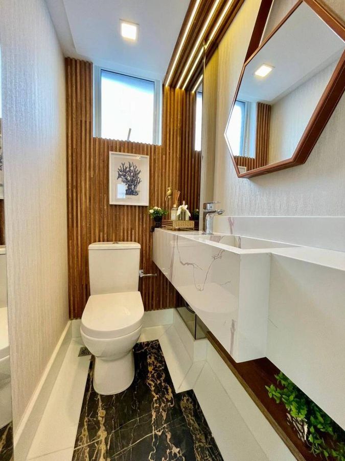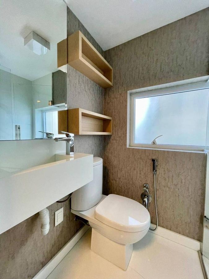 4 Suítes (sendo que 1 Suíte possui sacada e pé direito alto; e 2 suítes tem mezanino ) Lavabo