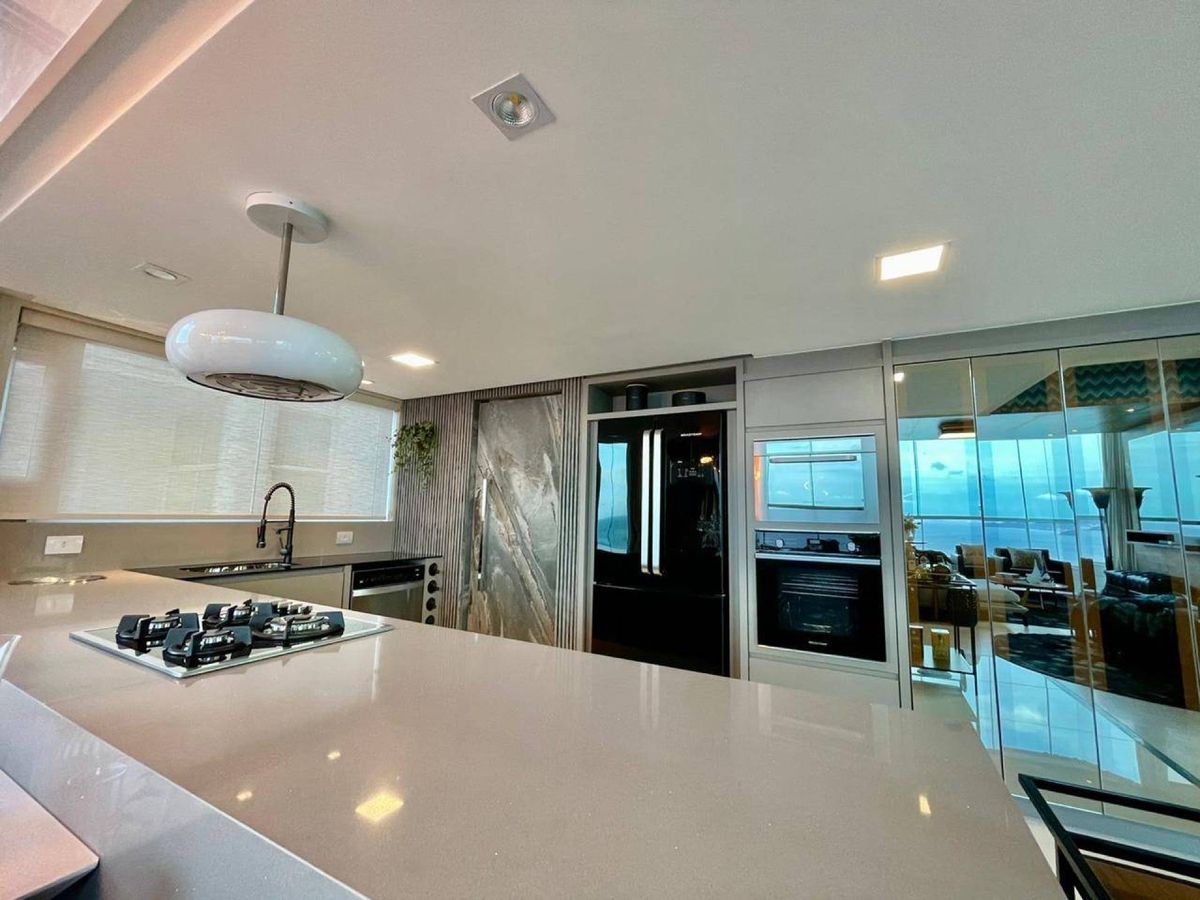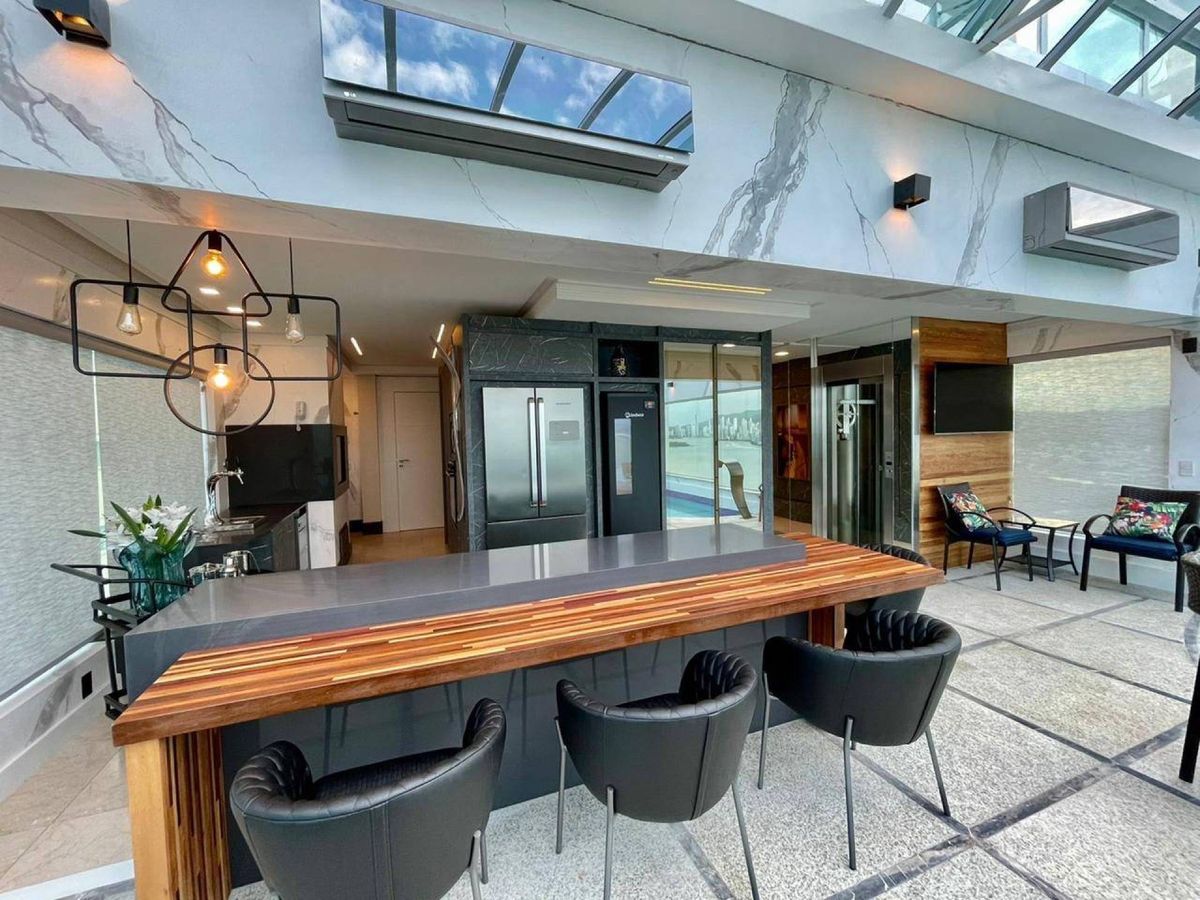 Área de Festa com cozinha completa e churrasqueira ( com paredes laterais de vidro duplos laminado e temperado)