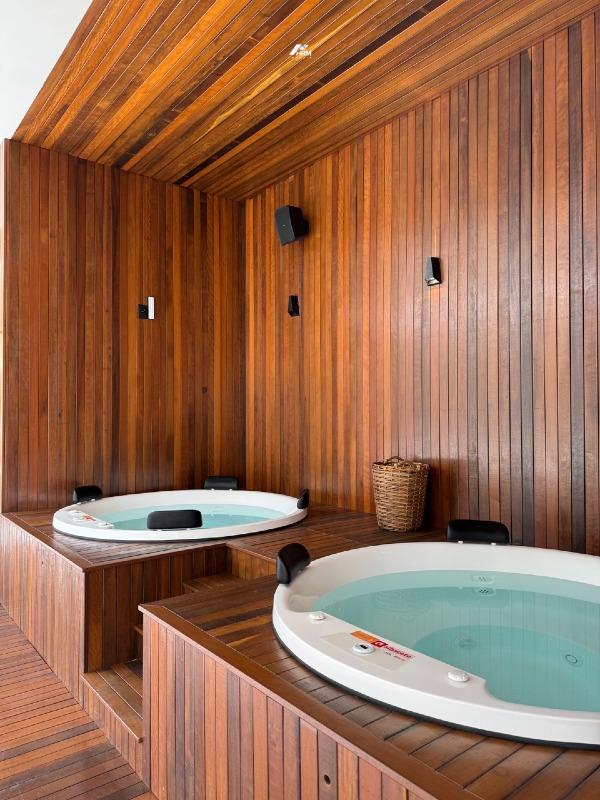 As áreas comuns proporcionam lazer e bem-estar para toda a família, incluindo piscina, piscina térmica, piscina infantil com hidromassagem, jacuzzi, sauna, academia, sala de jogos, salão de festas, espaço gourmet, bar, lounge e brinquedoteca. A estrutura também conta com elevador, hall decorado e mobiliado, guarita de segurança e entrada para banhistas com box de praia, conectando os moradores diretamente à orla.