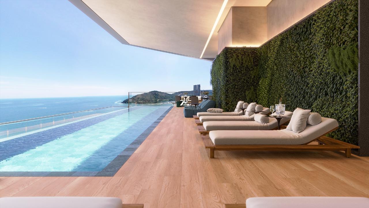 O condomínio possui lazer completo e exclusivo: piscina com borda infinita, piscinas térmicas cobertas (adulto e infantil), jacuzzi, spa, sauna, salão de festas, espaço gourmet com terraço frente-mar, wine bar, pub, brinquedoteca, playground e sala de jogos. Também inclui hall de entrada decorado, hall de banhistas, box de praia e área exclusiva para funcionários com cozinha, living e vestiários.